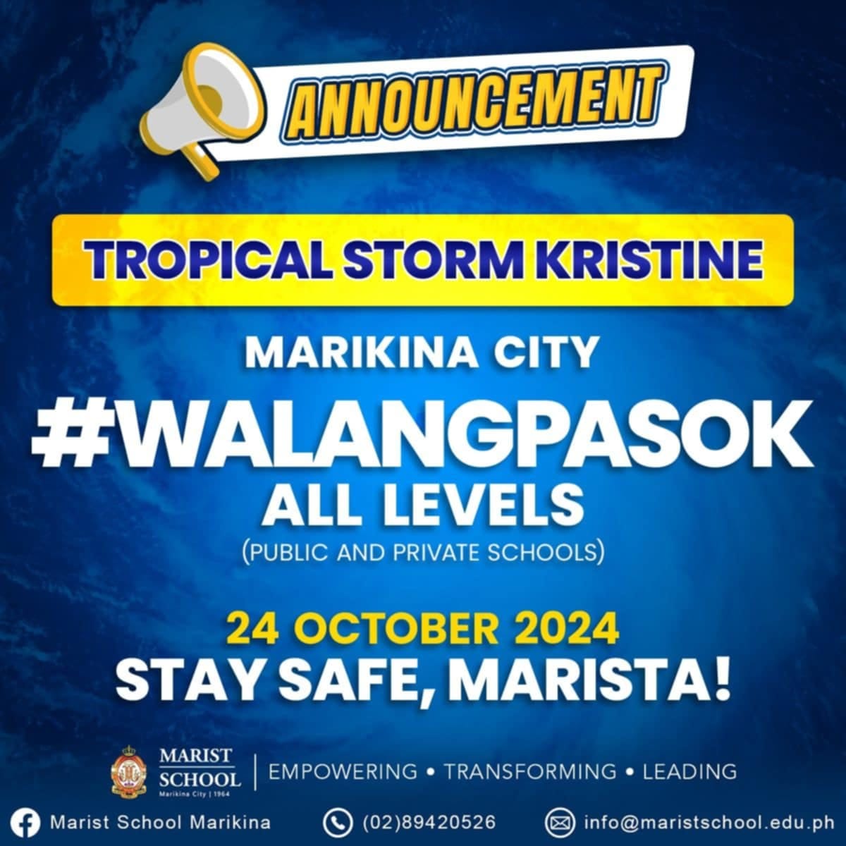 In line with the announcement of Mayor Marcy Teodoro of Marikina, please be informed that the health break is extended to allow all students, personnel and their family members to rest and recover.